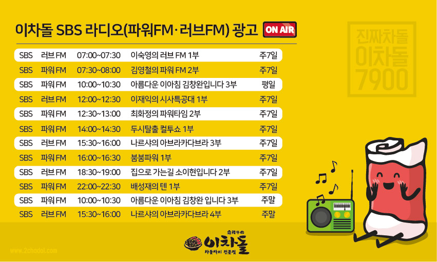 이제 매장뿐만아니라 전국 라디오를 통해 이차돌 CM 송을 만나보세요. :-)